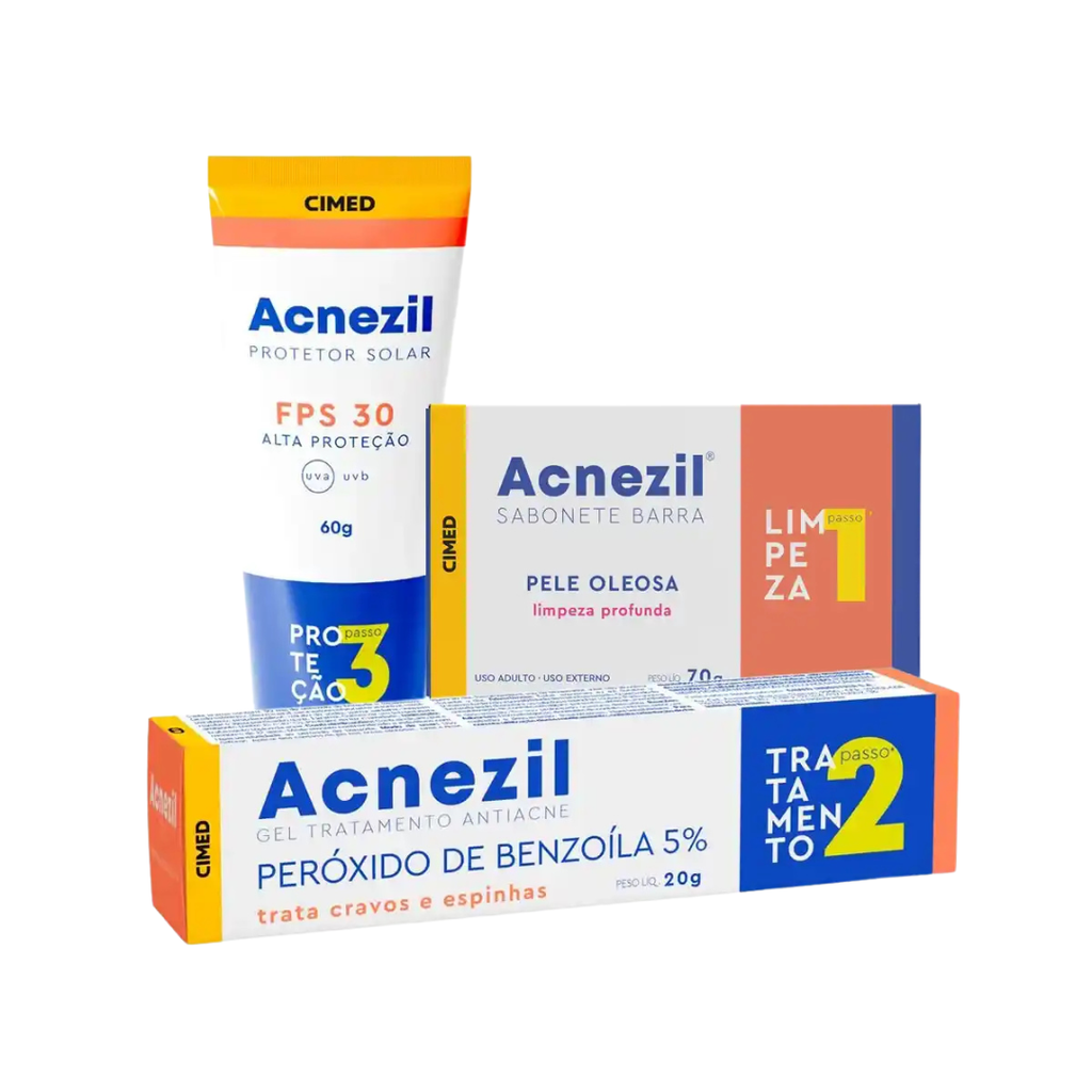 O Kit Acnezil Verão da Cimed é uma solução completa para o cuidado da pele oleosa e acneica, especialmente formulado para o clima quente. Composto por três produtos essenciais sabonete líquido, protetor solar FPS 30 e gel secativo —, oferece benefícios como: